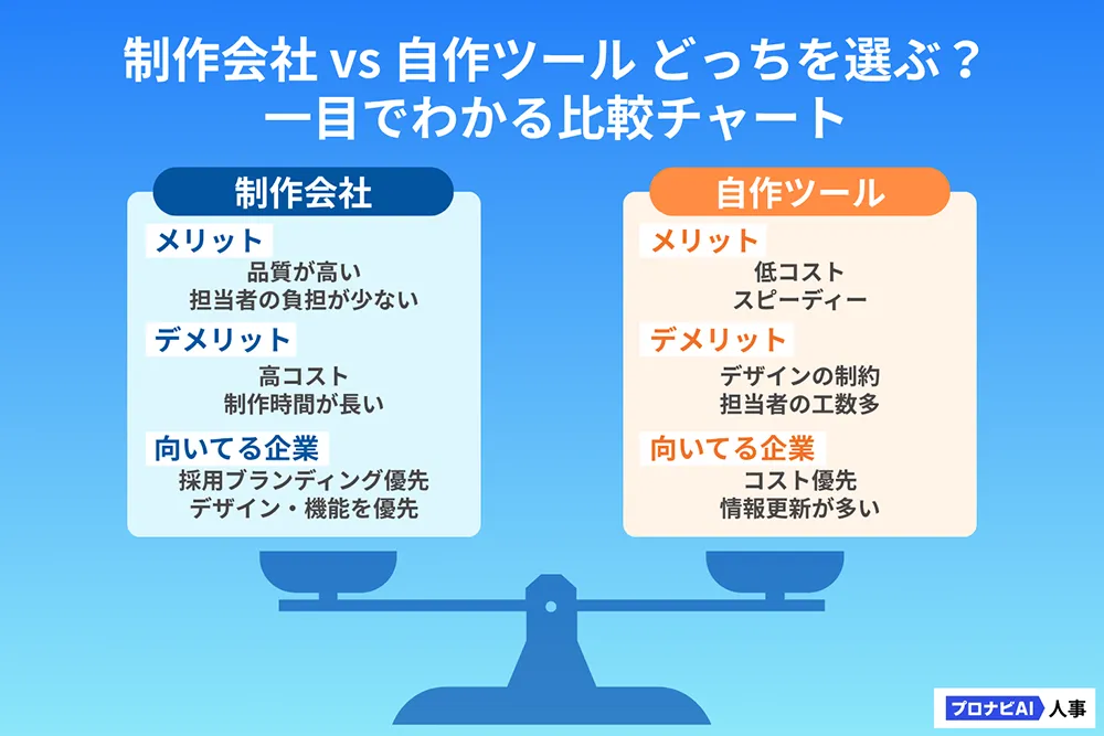 AIで原稿作成の目処が立ったところで、次に考えるべきは「誰がサイトを作るか」です。選択肢は主に「制作会社への依頼」と「採用サイト制作ツールでの自作」の2つです。