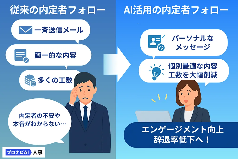 AIは、面接時の会話内容やアンケート結果といった情報を元に、内定者一人ひとりの興味・関心に合わせたパーソナルなメッセージを生成することが得意です。画一的ではない「あなただけに」という特別感を演出し、エンゲージメントを高めることができます。