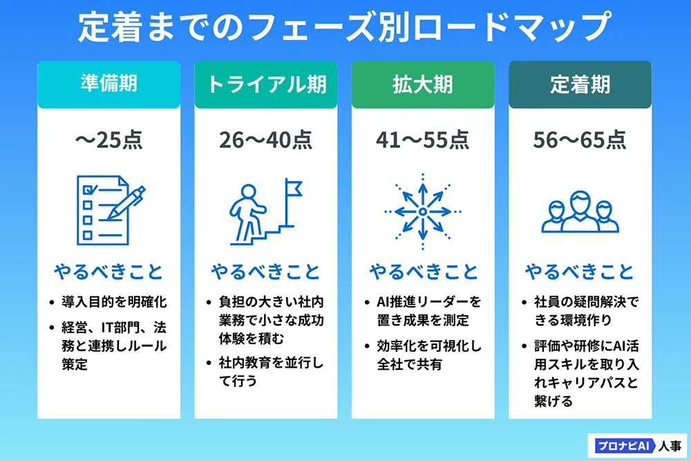 チェックリストで現状を確認したら、次は「どのような手順でAIを社内に根づかせるか」です。AIは導入しただけでは効果を発揮せず、業務に定着して初めて成果につながります。