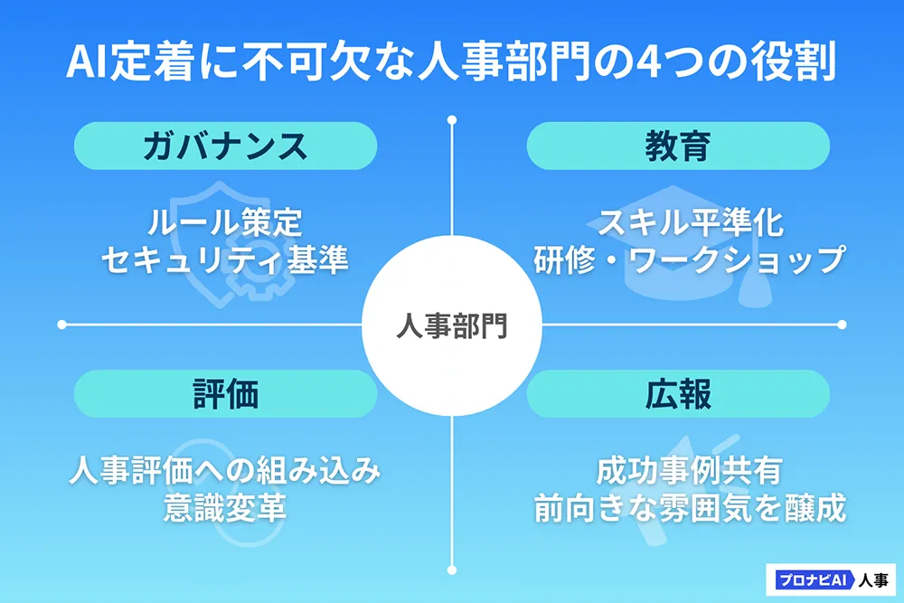 こうした課題を克服し、AIを社内に定着させるには「組織体制の整備」が欠かせません。特に人事部門は、ルール策定から教育、評価制度までを統合し、全社をつなぐ役割を担います。人事部門が押さえるべき4本柱は次の通りです。