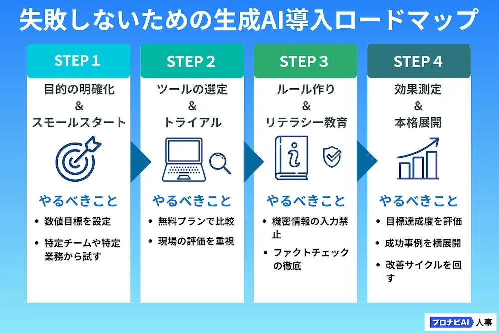 生成AIの導入は、計画的に進めることで成功確率が格段に上がります。組織でAIを効果的に導入・活用するための4つのステップをご紹介します。