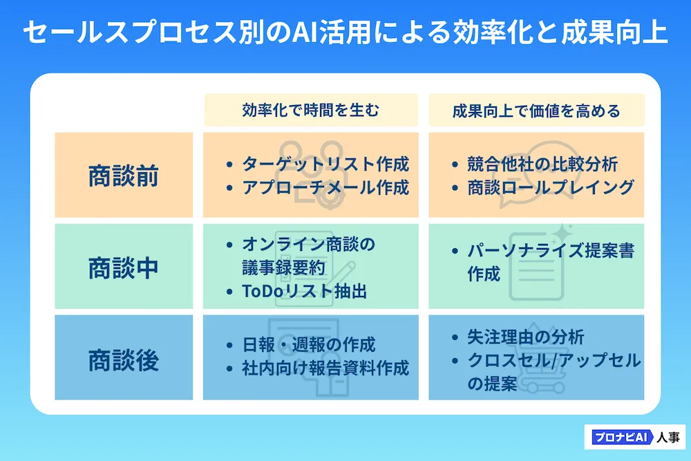 生成AIは、セールス業務のさまざまな場面で活用できます。ここでは、セールスプロセスを「効率化」と「成果向上」の2つの視点から整理し、明日から実践できる具体的な事例を10種類ご紹介します。