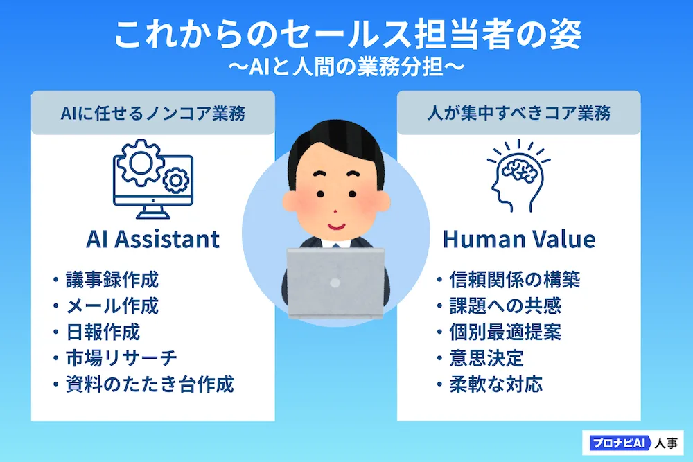 しかし、セールスの仕事が消えるわけではありません。AIに任せられる作業から解放されることで、顧客対応や戦略立案といったコア業務に集中できるチャンスが生まれます。