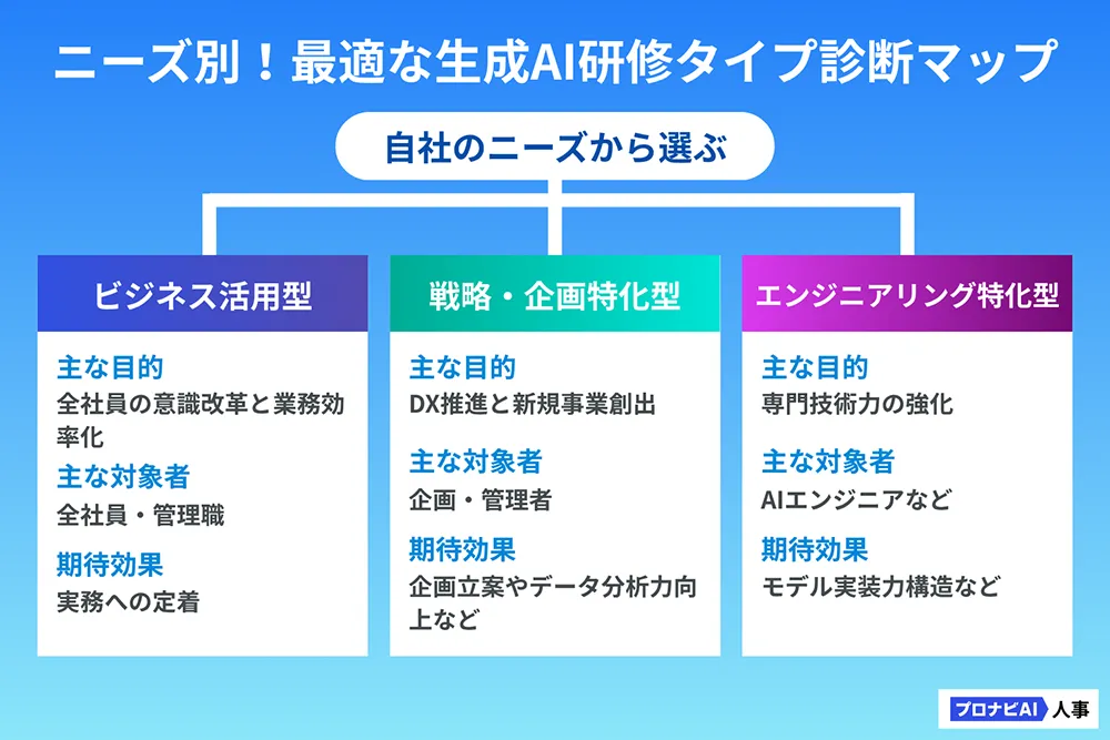 生成AI研修は、受講対象者と企業側が抱える課題によって大きく異なり、自社の課題に合致しない研修を選ぶと、時間とコストが無駄になってしまいます。まずは自社のニーズを明確にし、研修タイプを絞り込みましょう。