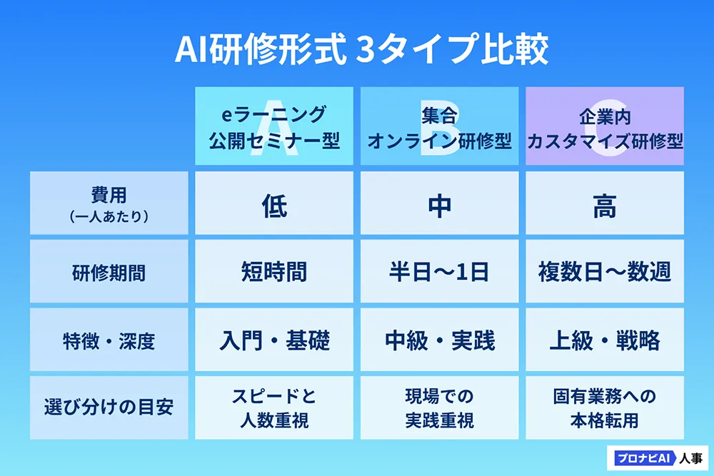 選び分けの目安はシンプルです。スピードと人数重視なら「A」、現場で成果を出す実践重視なら「B」、固有業務への本格適用や運用設計まで含めるなら「C」が有力候補になります。以降で各タイプの特徴と費用感、期待できる効果を具体的に確認します。
