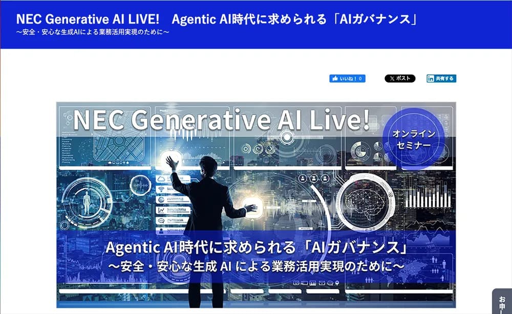 NEC 「NEC Generative AI LIVE!(AIガバナンス)」 | 無料オンライン(公開セミナー) | 1回完結 | 無料 | 無料のため受講ハードルが低い | 開催ごとにテーマ・日程が変動 | NEC Generative AI LIVE! |