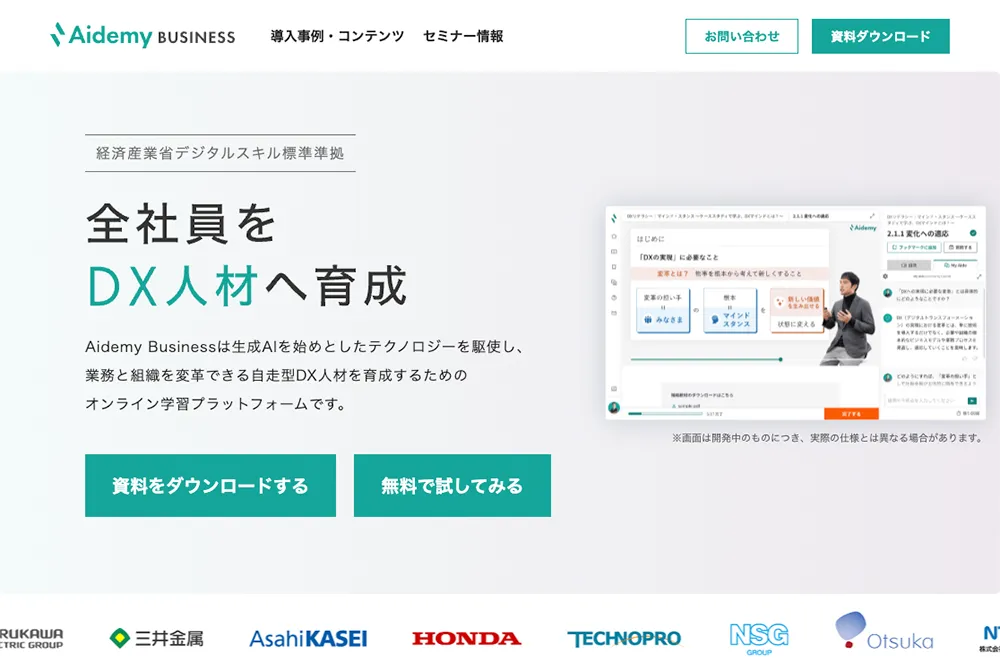 - デジタルスキル標準準拠のAI/DXコースが250種以上。要件定義→育成計画→効果測定までプロが伴走し、すべてオンラインで導入しやすい。