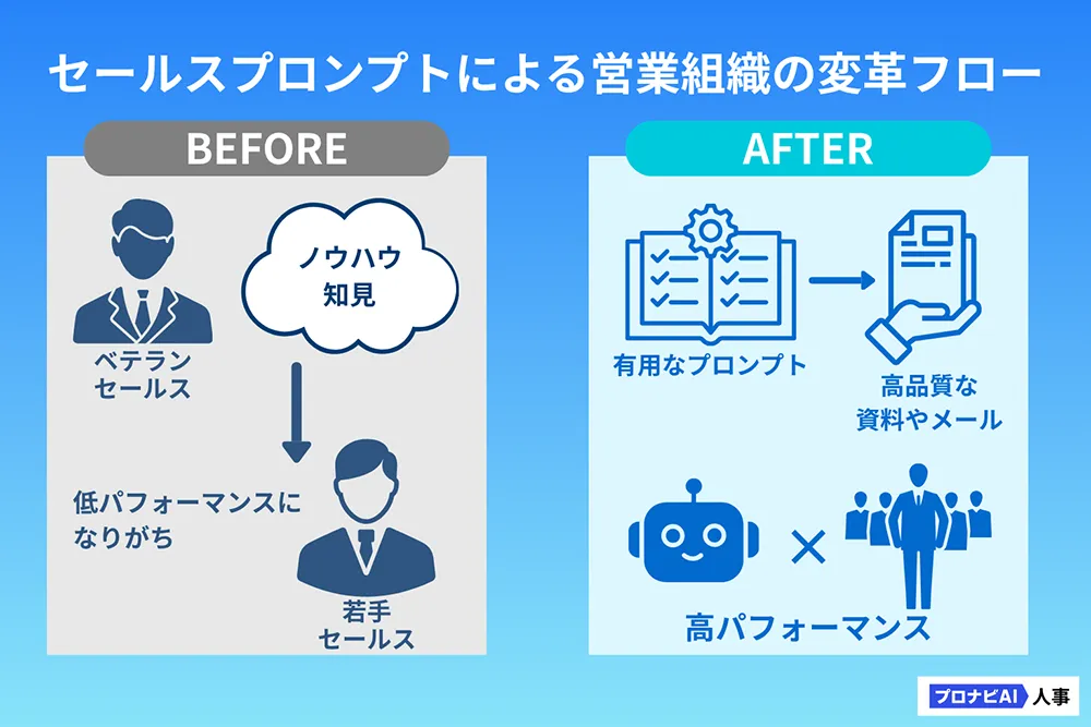 たとえば、顧客ごとに刺さる提案資料の構成や、反論への切り返しは、熟練のトップセールスだけが持つノウハウでした。セールスプロンプトは、こうした暗黙知をAIに渡す指示文として形式知化します。これにより、経験の浅いメンバーでも短時間で質の高い成果物を作成でき、ハイパフォーマーと同水準で業務を進められます。最終的に、営業チーム全体のパフォーマンスが向上し、属人化と非効率が解消されます