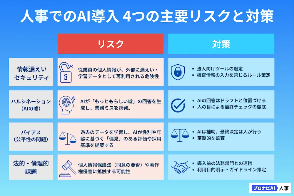 生成AIの導入はメリットばかりではありません。特に人事業務では、従業員の機密情報や評価の公平性に関わるため、以下のリスクを導入前に必ず理解し、対策を講じる必要があります。