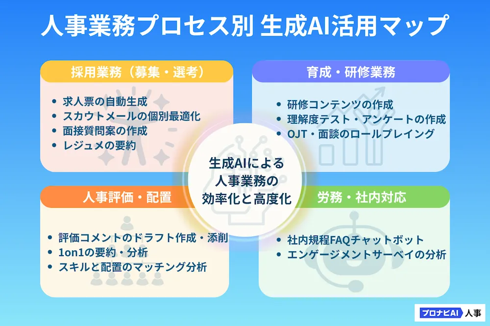 - 採用・育成・評価・労務など人事プロセス別の具体的な生成AI活用事例12選