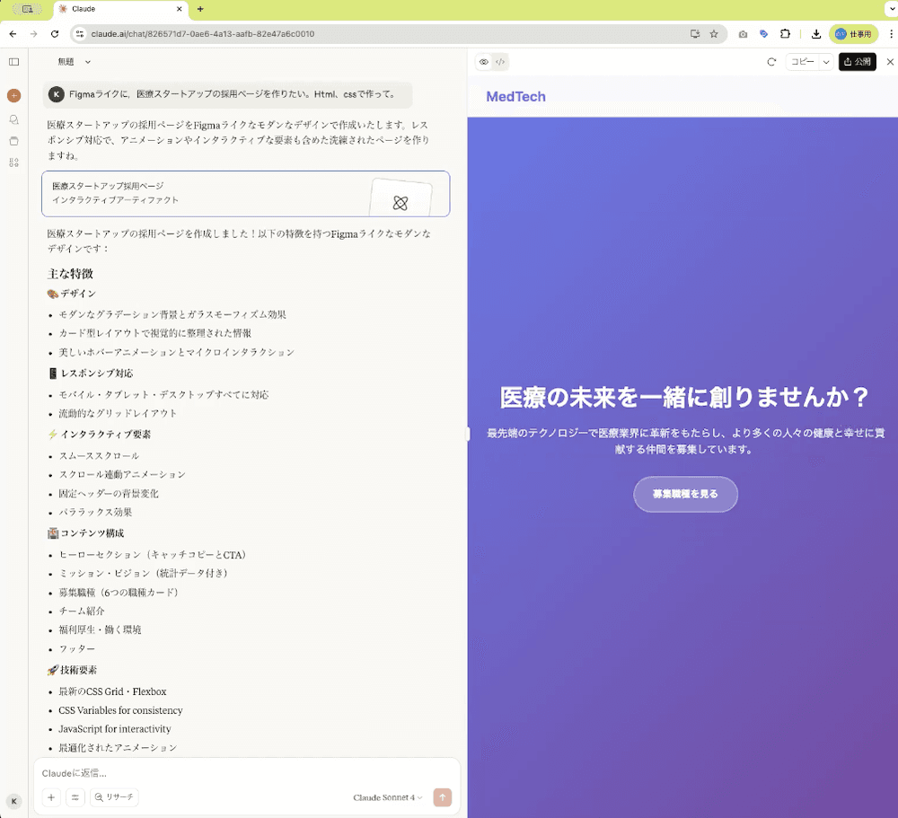 「Figmaライクに、医療スタートアップの採用ページをHTML CSSで作って。(以降に調査した情報を貼り付け)」
