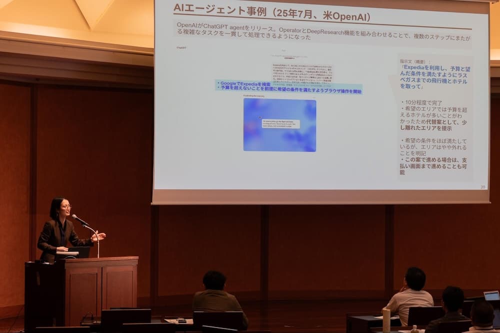 AIエージェントは、私たちの「頭脳労働」を代行する存在です。講演では「予算と条件に合わせてラスベガス行きのフライトとホテルを予約して」という指示に対し、AIが自律的に予約サイトを検索し、予算オーバーだった場合には代替案まで提案する事例が紹介されました。